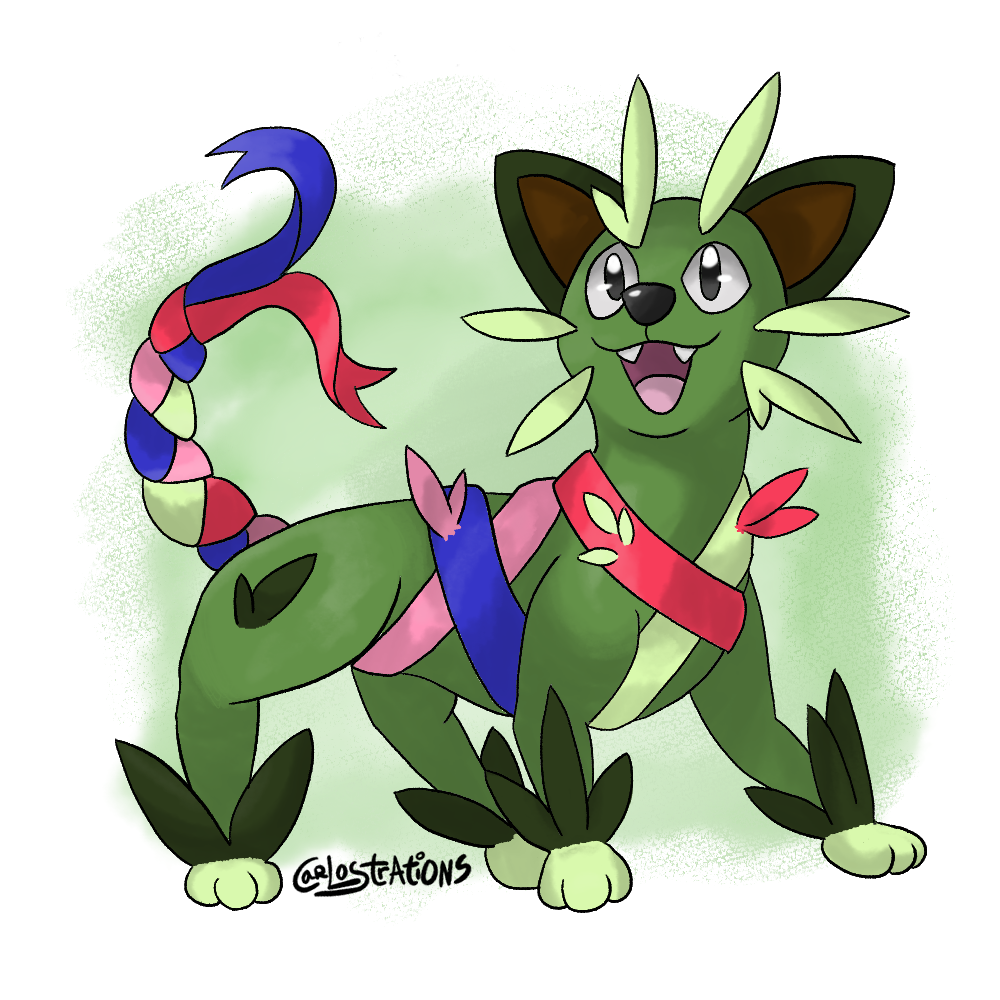 This Pokémon exists as the Izmis Region's grass starter. It has a colorful thread-like trail that is so long that it needs to be wrapped up in a ball. It's said to roam through the jungles of the region leaving all kinds of colorful plants and bushes growing in it's tracks almost like magic. It is said that this Pokémon has helped people weave the most beautiful textiles over multiple generations. As the planet has grown older and more interconnected, Pokémon professors found that it's abilities are over-exploited causing Knotelot to become more rare. Professors have worked to preserve this special species due to it's ancient connection to the land.
